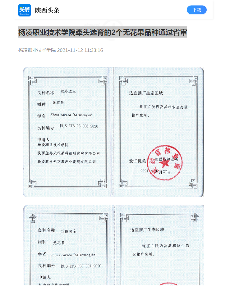 10月27日,陕西省林业局发布了2020年度陕西省林木良种名录,经陕西省林木和草品种审定委员会审定,全省共有33个品种为省级林木良种。由杨凌职业技术学院教授钱拴提团队选育的无花果新品种“丝路红玉”和“丝路黄金”通过省级林木良种审定,这是学校“双高”建设和提质培优行动计划的又一标志性成果。