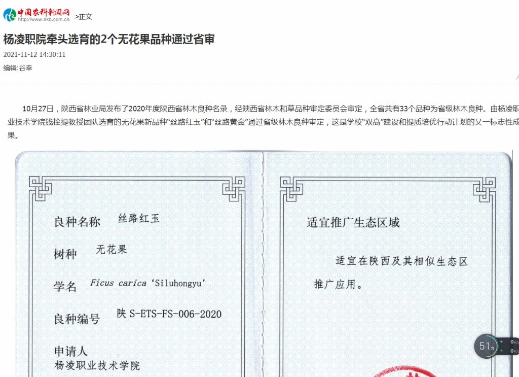 10月27日,陕西省林业局发布了2020年度陕西省林木良种名录,经陕西省林木和草品种审定委员会审定,全省共有33个品种为省级林木良种。由杨凌职业技术学院教授钱拴提团队选育的无花果新品种“丝路红玉”和“丝路黄金”通过省级林木良种审定,这是学校“双高”建设和提质培优行动计划的又一标志性成果。
