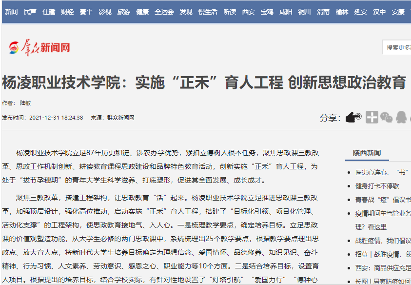 杨凌职业技术学院立足87年历史积淀、涉农办学优势,紧扣立德树人根本任务,聚焦思政课三教改革、思政工作机制创新、耕读教育课程思政建设和品牌特色教育活动,创新实施“正禾”育人工程,为处于“拔节孕穗期”的青年大学生科学滋养、打底塑形,促进其全面发展、成长成才。