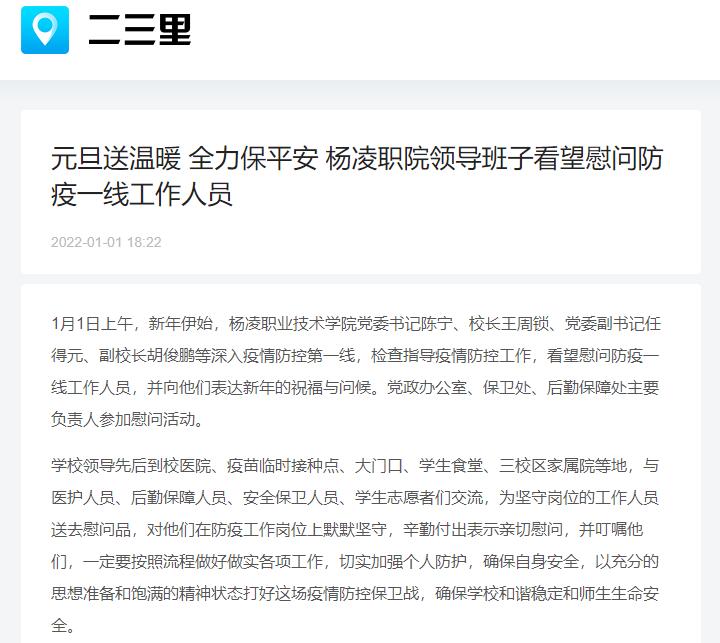 1月1日上午,新年伊始,杨凌职业技术学院党委书记陈宁、校长王周锁、党委副书记任得元、副校长胡俊鹏等深入疫情防控第一线,检查指导疫情防控工作,看望慰问防疫一线工作人员,并向他们表达新年的祝福与问候。党政办公室、保卫处、后勤保障处主要负责人参加慰问活动。