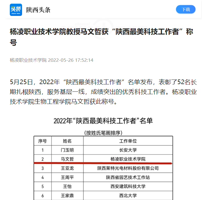 5月25日,2022年“陕西最美科技工作者”名单发布,表彰了52名长期扎根陕西,服务基层一线,成绩突出的优秀科技工作者。杨凌职业技术学院生物工程学院马文哲获此称号。