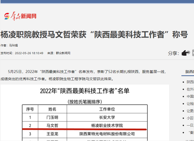 5月25日,2022年“陕西最美科技工作者”名单发布,表彰了52名长期扎根陕西,服务基层一线,成绩突出的优秀科技工作者。杨凌职院生物工程学院马文哲获此殊荣。
