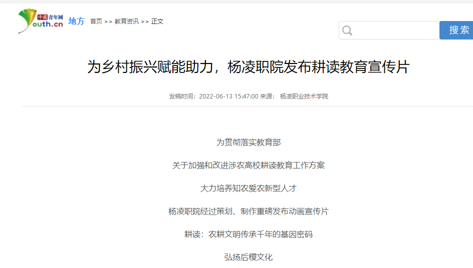 为贯彻落实教育部关于《加强和改进涉农高校耕读教育工作方案》,大力培养知农爱农新型人才,杨凌职院经过策划、制作,重磅发布动画宣传片《耕读:农耕文明传承千年的基因密码》,弘扬后稷文化,构建“力耕勤读”的全方位耕读教育体系,为乡村振兴赋能助力。