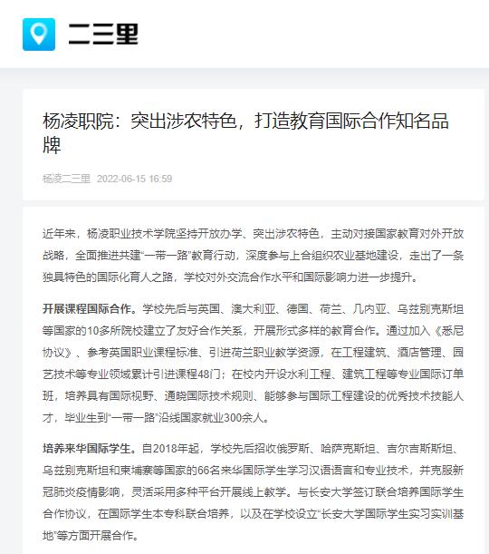 近年来,杨凌职业技术学院坚持开放办学、突出涉农特色,主动对接国家教育对外开放战略,全面推进共建“一带一路”教育行动,深度参与上合组织农业基地建设,走出了一条独具特色的国际化育人之路,学校对外交流合作水平和国际影响力进一步提升。