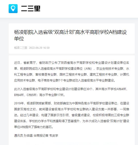 2019年,杨凌职业技术学院被教育部、财政部确定为中国特色高水平高职学校建设单位,在建设国家双高校之初,就将建设省级高水平学校和专业群纳入建设方案一并部署,一同推进。经过几年建设,构建了国家示范引领、省级重点建设、校级积极培育的三级专业群建设体系,学校的办学水平和质量取得了显著提升,为本次成功入选省级“双高计划”建设单位A档提供了强有力的基石。(通讯员 孙启昌 华商报记者 韦武学)