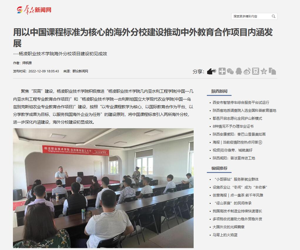 为推进海外分校建设,学校专门制定了《杨凌职业技术学院海外分校项目建设实施管理办法(暂行)》,规范指导学校各相关部门高质量落实海外分校建设各项工作任务。此外,按照海外分校合作协议内容,进一步细化专业课程建设内容,根据国外教育现状,对标合作专业人才培养方案,开发形成了两套海外分校专业《课堂教学指引》《实践教学指导》教学文件,进一步凸显了中国课程标准在海外分校建设中的引领作用。