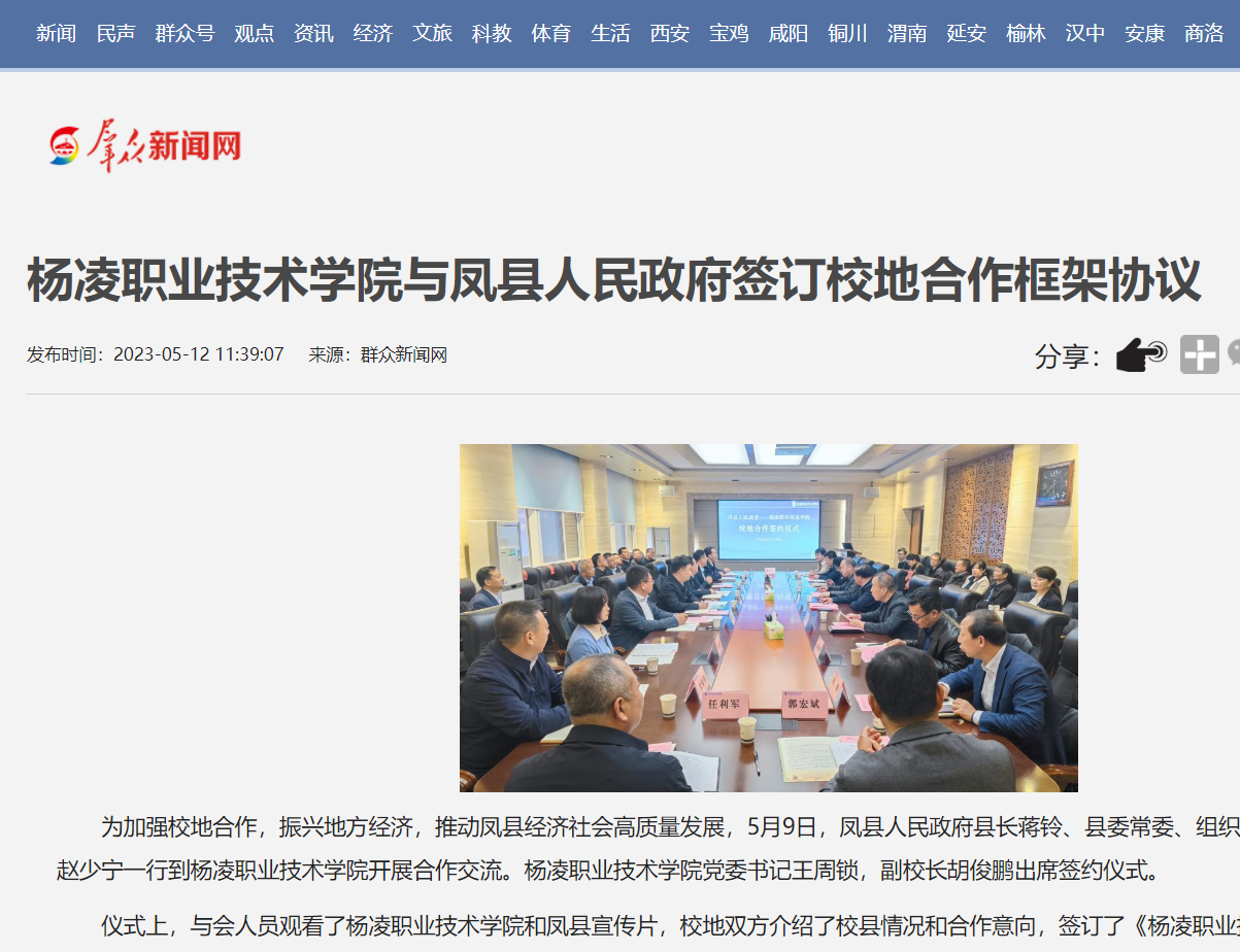 为加强校地合作,振兴地方经济,推动凤县经济社会高质量发展,5月9日,凤县人民政府县长蒋铃、县委常委、组织部部长焦宝生、副县长赵少宁一行到杨凌职业技术学院开展合作交流。杨凌职业技术学院党委书记王周锁,副校长胡俊鹏出席签约仪式。