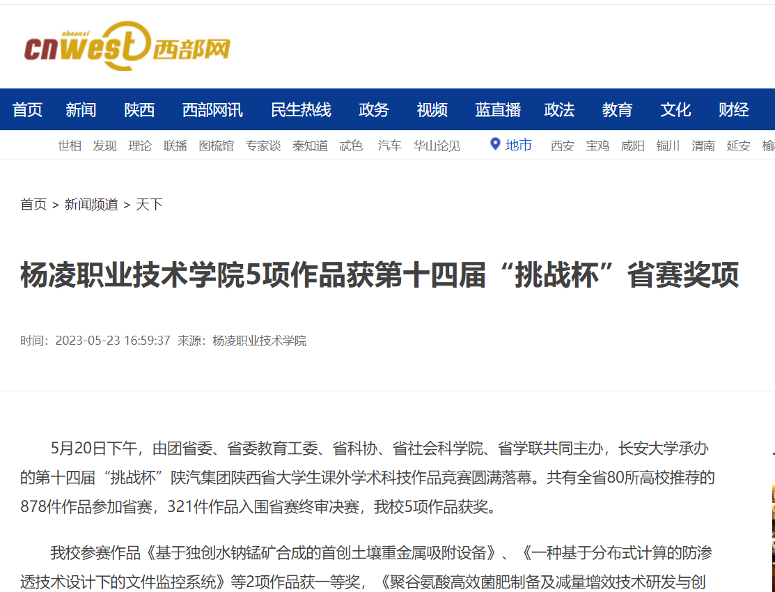 【西部网】杨凌职业技术学院5项作品获第十四届“挑战杯”省赛奖项