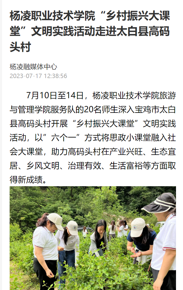 7月10日至14日,杨凌职业技术学院旅游与管理学院服务队的20名师生深入宝鸡市太白县高码头村开展“乡村振兴大课堂”文明实践活动,以”六个一”方式将思政小课堂融入社会大课堂,助力高码头村在产业兴旺、生态宜居、乡风文明、治理有效、生活富裕等方面取得新成绩。