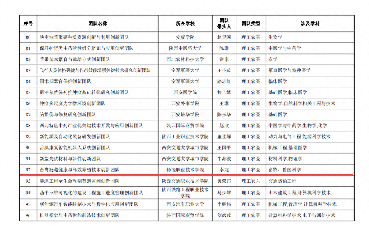 阳光讯( 记者 赵小康 通讯员 郭亚洲/文 崔晓/图 )8月29日,省教育厅公布了2023年度陕西高校青年创新团队入选名单,杨凌职业技术学院李龙教授牵头的畜禽肠道健康与高效养殖技术创新团队成功入选。