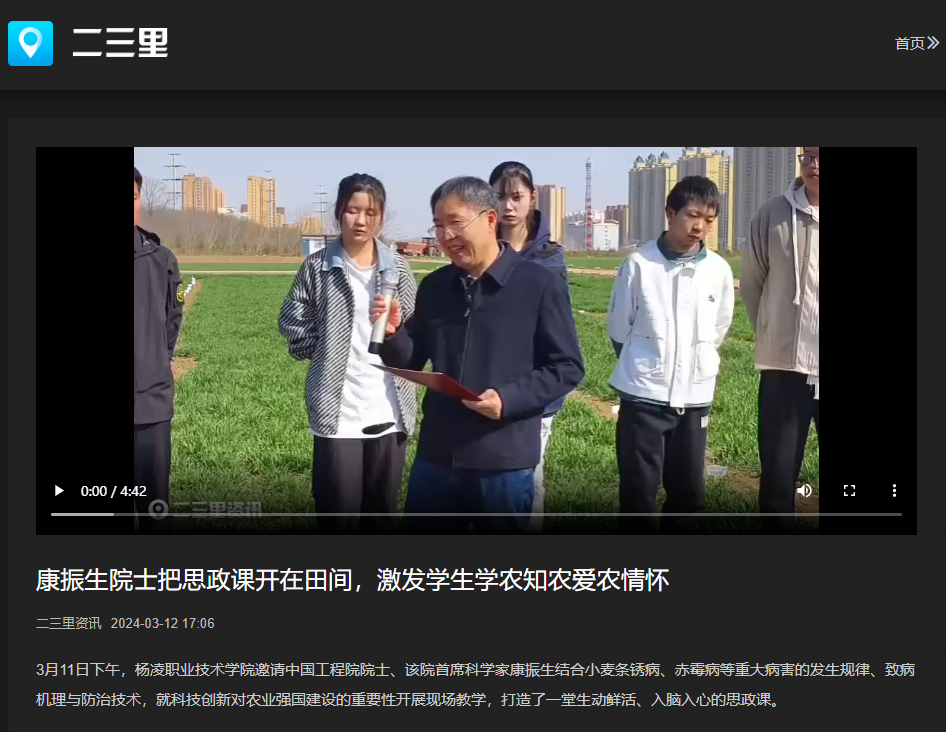 3月11日下午,杨凌职业技术学院邀请中国工程院院士、该院首席科学家康振生结合小麦条锈病、赤霉病等重大病害的发生规律、致病机理与防治技术,就科技创新对农业强国建设的重要性开展现场教学,打造了一堂生动鲜活、入脑入心的思政课。