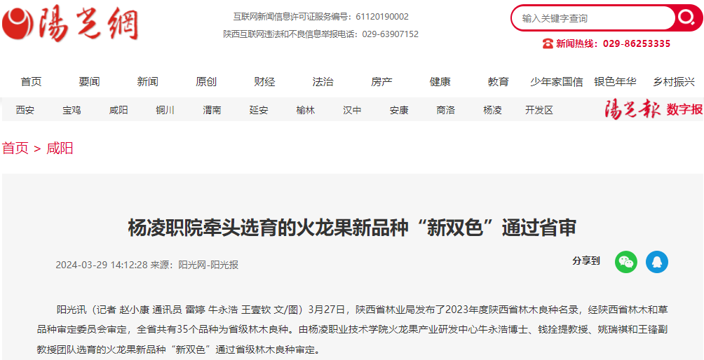 阳光讯(记者 赵小康 通讯员 雷婷 牛永浩 王壹钦 文/图)3月27日,陕西省林业局发布了2023年度陕西省林木良种名录,经陕西省林木和草品种审定委员会审定,全省共有35个品种为省级林木良种。由杨凌职业技术学院火龙果产业研发中心牛永浩博士、钱拴提教授、姚瑞祺和王锋副教授团队选育的火龙果新品种“新双色”通过省级林木良种审定。