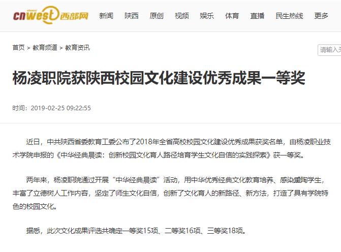 近日,中共陕西省委教育工委公布了2018年全省高校校园文化建设优秀成果获奖名单,由杨凌职业技术学院申报的《中华经典晨读:创新校园文化育人路径培育学生文化自信的实践探索》获一等奖。