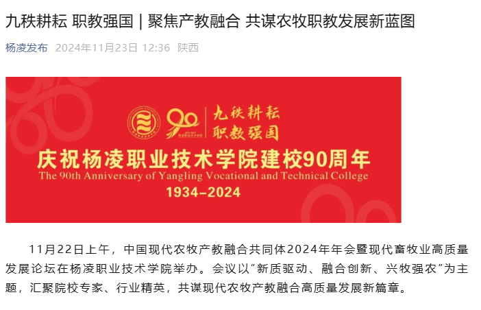 据悉,中国现代农牧产教融合共同体成立于2023年10月24日,是由北京大北农科技集团股份有限公司、西北农林科技大学、杨凌职业技术学院牵头,联合全国30余个省市涉农、涉牧上下游企业、院校、行业组织和科研机构等92家单位共同组建而成。共同体成立一年以来,杨凌职业技术学院在创新人才培养机制、提升高技能人才培养质量、优化专业核心课程体系、加强职业技能培训、促进现代农牧行业高质量发展等方面取得了显著成效。