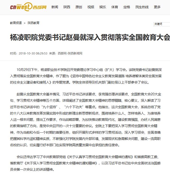 10月29日下午,杨凌职业技术学院召开党委理论学习中心组(扩大)学习会。该院党委书记赵曼就深入贯彻落实全国教育大会精神,作了题为《坚持中国特色社会主义教育发展道路 培养德智体美劳全面发展的社会主义建设者和接班人》的专题党课。学院全体领导及机关部门副处级以上干部参会了会议。