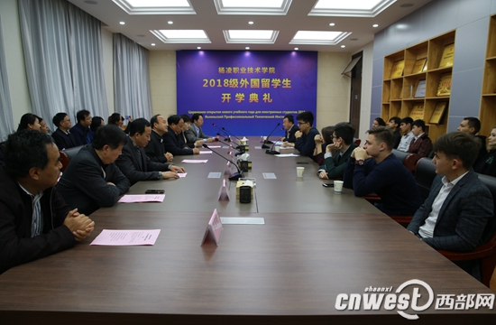10月22日上午,杨凌职业技术学院2018级外国留学生开学典礼在西校区动物工程分院会议室举行。学院党委书记赵曼,院长王周锁,副院长张永良,党委委员、党政办主任祝战斌,党委委员、教务处处长张宏辉,哈斯克斯坦一体化基金会代表李倩,国际合作交流处、党委学生处、保卫处、生物工程分院主要负责人,以及来自哈萨克斯坦、俄罗斯、吉尔吉斯斯坦、乌斯别克斯坦的18名留学生,生物工程分院部分师生代表参加了开学典礼。