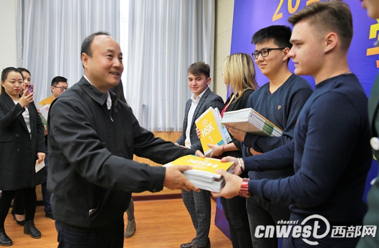 典礼仪式上,全体外国留学生签订了奖学金学习承诺书和安全承诺书;党委书记赵曼、院长王周锁,副院长张永良,分别代表学院向18名留学生赠发了汉语教学课本。