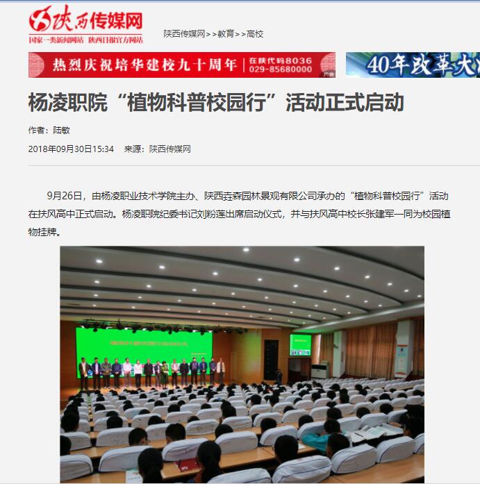 9月26日,由杨凌职业技术学院主办、陕西垚森园林景观有限公司承办的“植物科普校园行”活动在扶风高中正式启动。杨凌职院纪委书记刘粉莲出席启动仪式,并与扶风高中校长张建军一同为校园植物挂牌。