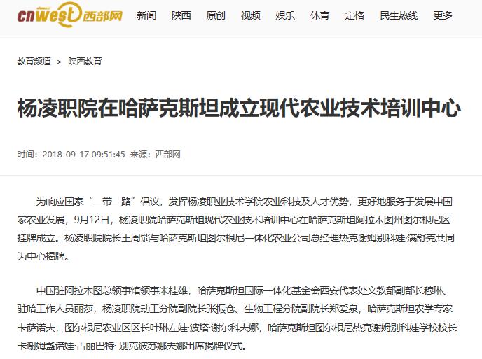 为响应国家“一带一路”倡议,发挥杨凌职业技术学院农业科技及人才优势,更好地服务于发展中国家农业发展,9月12日,杨凌职院哈萨克斯坦现代农业技术培训中心在哈萨克斯坦阿拉木图州图尔根尼区挂牌成立。杨凌职院院长王周锁与哈萨克斯坦图尔根尼一体化农业公司总经理热克谢姆别科娃·满舒克共同为中心揭牌。