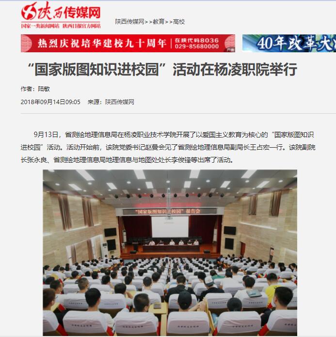 9月13日,省测绘地理信息局在杨凌职业技术学院开展了以爱国主义教育为核心的“国家版图知识进校园”活动。活动开始前,该院党委书记赵曼会见了省测绘地理信息局副局长王占宏一行。该院副院长张永良、省测绘地理信息局地理信息与地图处处长李俊锋等出席了活动。
