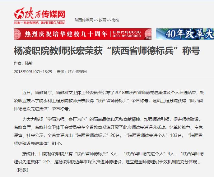 近日,省教育厅、省教科文卫体工会委员会公布了2018年陕西省师德先进集体及个人评选结果,杨凌职业技术学院水利工程分院教师张宏获得“陕西省师德标兵”荣誉称号,建筑工程分院获得“陕西省师德建设先进集体”荣誉称号。