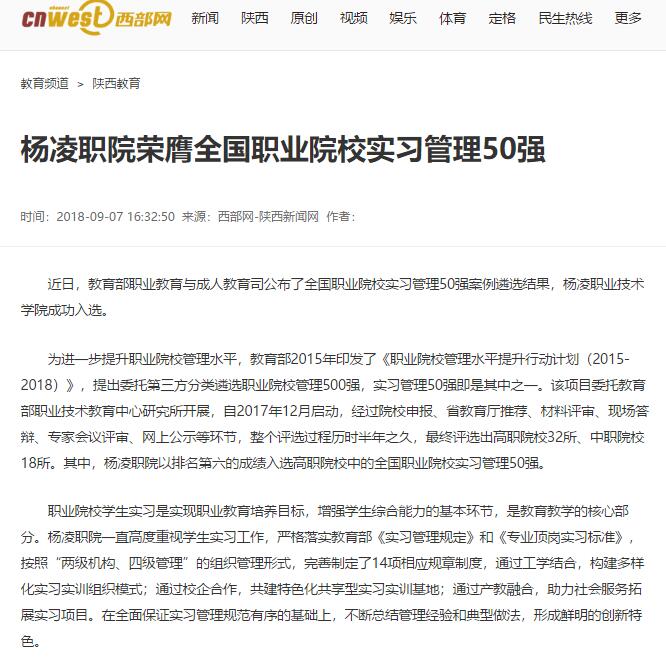 近日,教育部职业教育与成人教育司公布了全国职业院校实习管理50强案例遴选结果,杨凌职业技术学院成功入选。