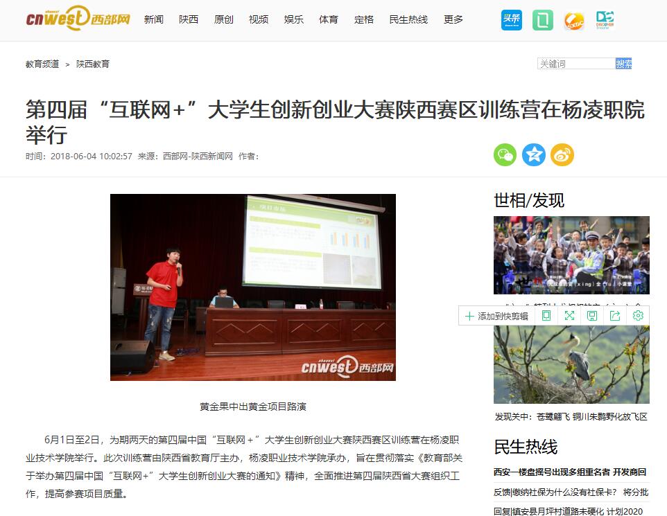 6月1日至2日,为期两天的第四届中国“互联网+”大学生创新创业大赛陕西赛区训练营在杨凌职业技术学院举行。此次训练营由陕西省教育厅主办,杨凌职业技术学院承办,旨在贯彻落实《教育部关于举办第四届中国“互联网+”大学生创新创业大赛的通知》精神,全面推进第四届陕西省大赛组织工作,提高参赛项目质量。