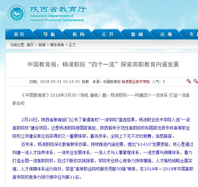 《中国教育报》2018年5月30(陈吼 崔晓)题:杨凌职院——构建四个一流体系 打造一流高职名校