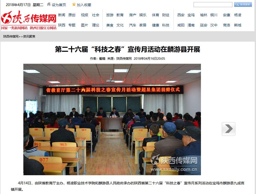 4月14日,由陕省教育厅主办,杨凌职业技术学院和麟游县人民政府承办的陕西省第二十六届“科技之春”宣传月系列活动在宝鸡市麟游县九成宫镇开展。