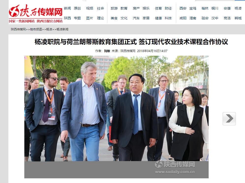 2016年,杨凌职院院与荷兰朗蒂斯教育集团签订现代农业合作备忘录,同年7月该院选派20名青年骨干教师赴荷兰进行了为期14天的现代农业高级技术培训。2017年,荷兰朗蒂斯教育集团与由该院主导的中国杨凌现代农业教育集团签订了战略合作协议,并就双方开展现代农业技术课程合作进行商讨与对接。“中荷现代农业技术课程”合作项目是该院与荷兰朗蒂斯教育集团过去数年在涉农领域专业合作的深化与延伸,旨在通过课程合作,进一步推进学院涉农专业课程的国际化改革,加快课程国际化标准的制定。该项目涉及育种、繁殖等12门农业专业课程的教学方法等内容,将在一年半内分3期进行实施。期间,荷兰专家将定期来该院与我院生物工程分院专业教师开展课程对接与交流。
