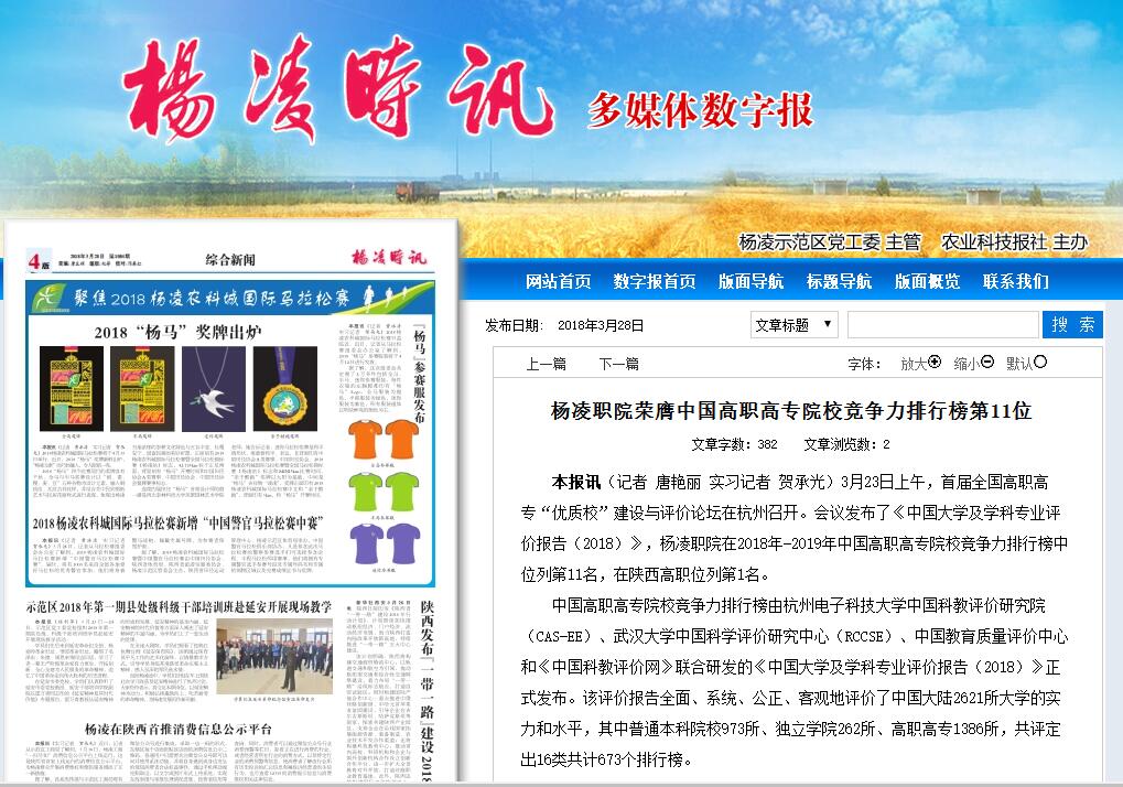 本报讯(记者 唐艳丽 实习记者 贺承光)3月23日上午,首届全国高职高专“优质校”建设与评价论坛在杭州召开。会议发布了《中国大学及学科专业评价报告(2018)》,杨凌职院在2018年-2019年中国高职高专院校竞争力排行榜中位列第11名,在陕西高职位列第1名。