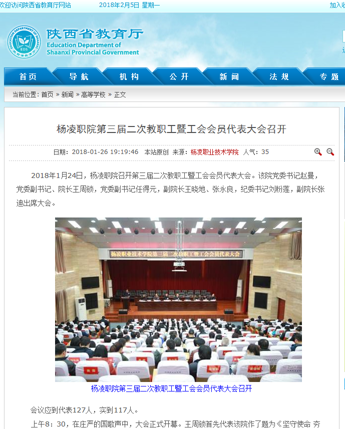 2018年1月24日,杨凌职院召开第三届二次教职工暨工会会员代表大会。该院党委书记赵曼,党委副书记、院长王周锁,党委副书记任得元,副院长王晓地、张永良,纪委书记刘粉莲,副院长张迪出席大会。