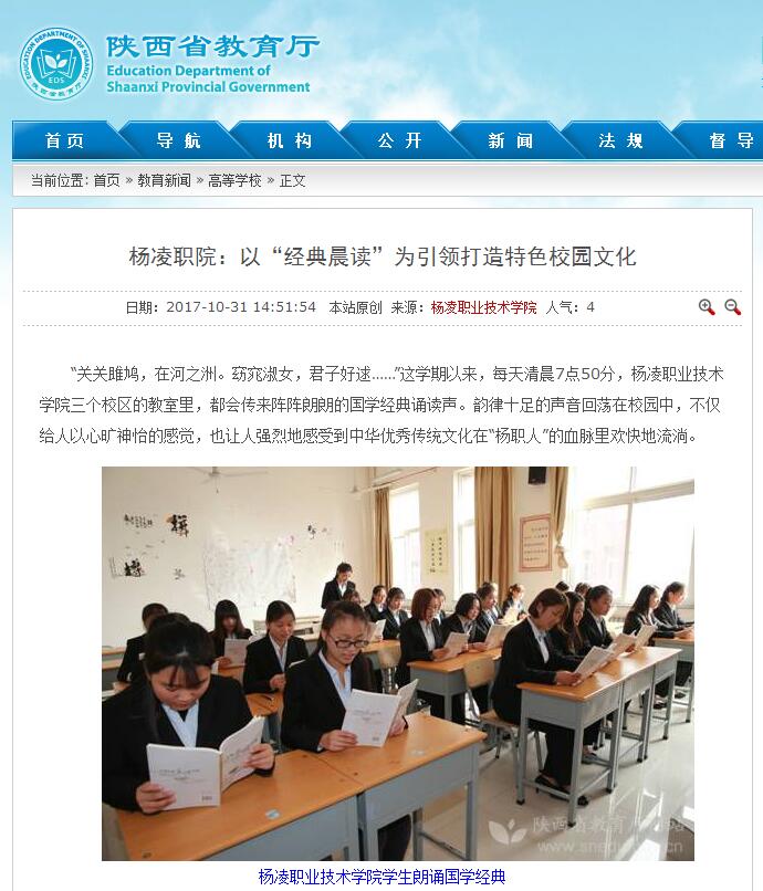 为贯彻全国高校思想政治工作会议精神,用中华优秀经典文化教育培养、感染熏陶学生,丰富立德树人工作内容,坚定师生文化自信,创设培养德才兼备、全面发展的社会主义建设者和接班人的新方式、新方法、新路径和新载体,打造具有学院特色的校园文化。从今年10月9日开始,杨凌职业技术学院启动实施“中华经典晨读”活动。