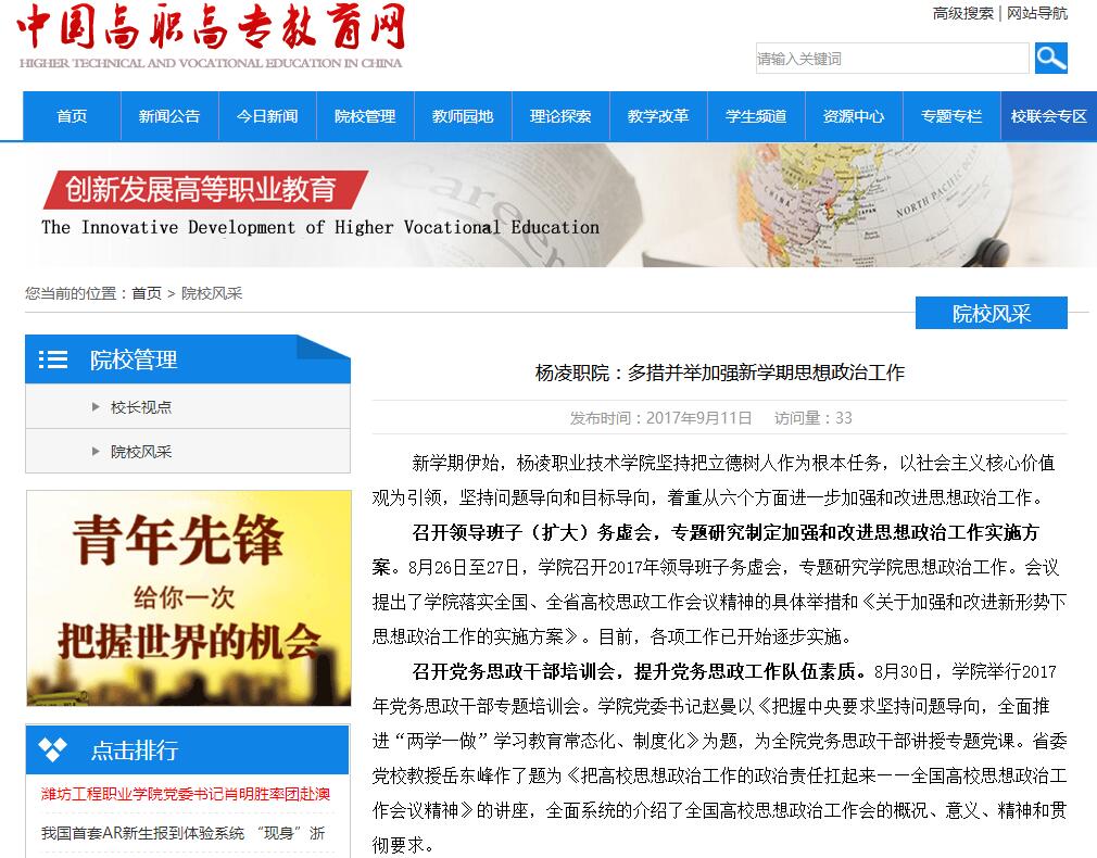 新学期伊始,杨凌职业技术学院坚持把立德树人作为根本任务,以社会主义核心价值观为引领,坚持问题导向和目标导向,着重从六个方面进一步加强和改进思想政治工作。