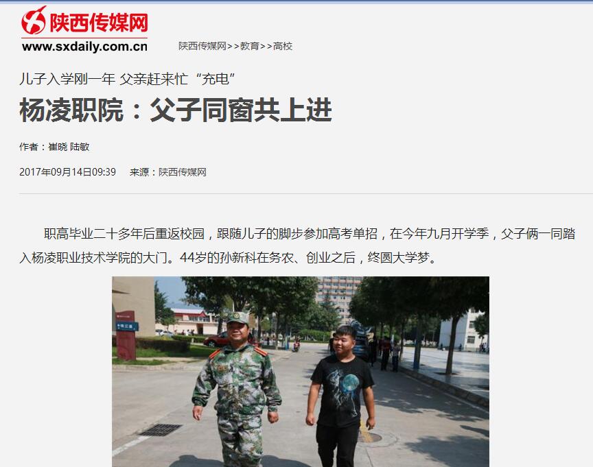 在儿子孙英康填报高考志愿时,孙新科建议儿子选择杨凌职院,而这也是儿子自己的意愿。2016年高考前几个月,孙英康无意中在一份报纸上看到杨凌职院的宣传,这所学校悠久的办学历史、深厚的文化底蕴一下子吸引了他。“根据自己平时的成绩,我就直接报名参加了杨凌职业技术学院的单招考试。”最终,孙英康以388分被杨凌职院录取。