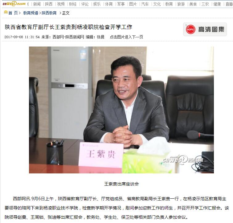 西部网讯 9月6日上午,陕西省教育厅副厅长、厅党组成员、省高教局副局长王紫贵一行,在杨凌示范区教育局主要领导的陪同下来到杨凌职业技术学院,检查新学期开学情况,慰问参加迎新工作的师生,并召开开学工作汇报会。该院领导赵曼、王周锁、张迪等出席汇报会,教务处、学生处、保卫处等相关部门负责人参加会议。