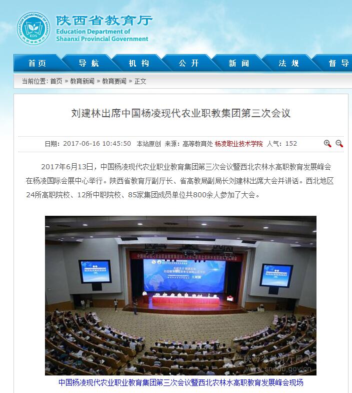 2017年6月13日,中国杨凌现代农业职业教育集团第三次会议暨西北农林水高职教育发展峰会在杨凌国际会展中心举行。陕西省教育厅副厅长、省高教局副局长刘建林出席大会并讲话。西北地区24所高职院校、12所中职院校、85家集团成员单位共800余人参加了大会。