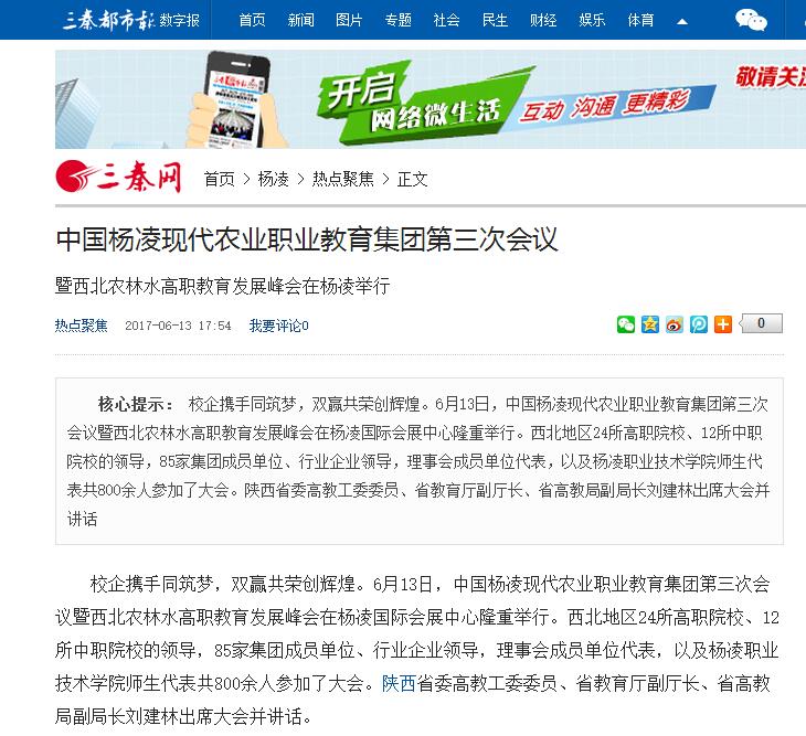 校企携手同筑梦,双赢共荣创辉煌。6月13日,中国杨凌现代农业职业教育集团第三次会议暨西北农林水高职教育发展峰会在杨凌国际会展中心隆重举行。西北地区24所高职院校、12所中职院校的领导,85家集团成员单位、行业企业领导,理事会成员单位代表,以及杨凌职业技术学院师生代表共800余人参加了大会。陕西省委高教工委委员、省教育厅副厅长、省高教局副局长刘建林出席大会并讲话。