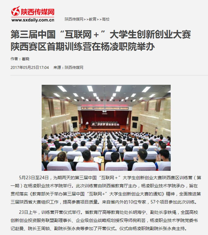 5月23日至24日,为期两天的第三届中国“互联网+”大学生创新创业大赛陕西赛区训练营(第一期)在杨凌职业技术学院举行。此次训练营由陕西省教育厅主办,杨凌职业技术学院承办,旨在贯彻落实《教育部关于举办第三届中国“互联网+”大学生创新创业大赛的通知》精神,全面推进第三届陕西省大赛组织工作,提高参赛项目质量。来自省内外的10位专家,57个项目参加此次训练。