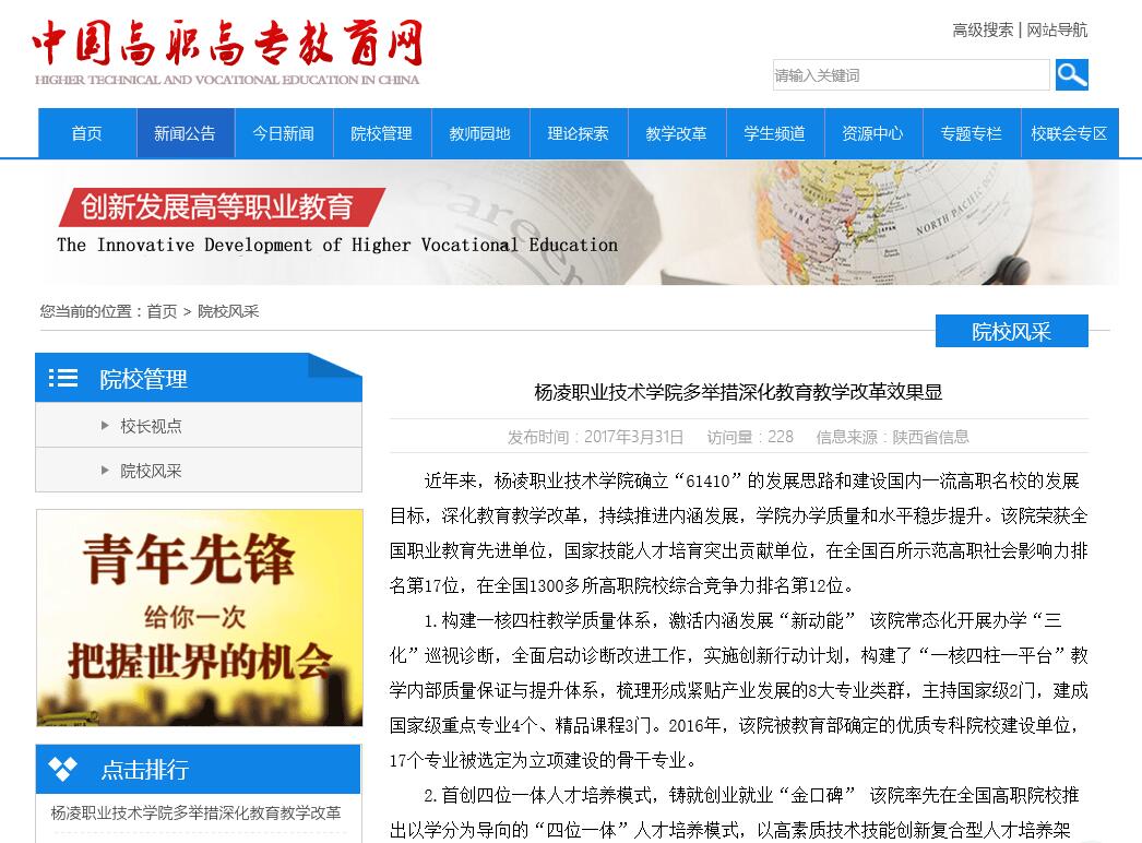 近年来,杨凌职业技术学院确立“61410”的发展思路和建设国内一流高职名校的发展目标,深化教育教学改革,持续推进内涵发展,学院办学质量和水平稳步提升。该院荣获全国职业教育先进单位,国家技能人才培育突出贡献单位,在全国百所示范高职社会影响力排名第17位,在全国1300多所高职院校综合竞争力排名第12位。