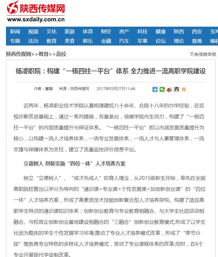 近两年,杨凌职业技术学院认真梳理建校八十余年、合院十八年的办学经验,在巡视诊断改进基础上,通过一系列措施,夯基垒台,培植学院内生动力,构建了“一核四柱一平台”的内部质量提升与保证体系。“一核四柱一平台”即以内涵发展质量提升为核心,以构建一流人才培养体系,一流专业发展体系,一流人才与人事管理体系,一流支撑与保障体系为支柱,建立了质量监控评价信息平台。