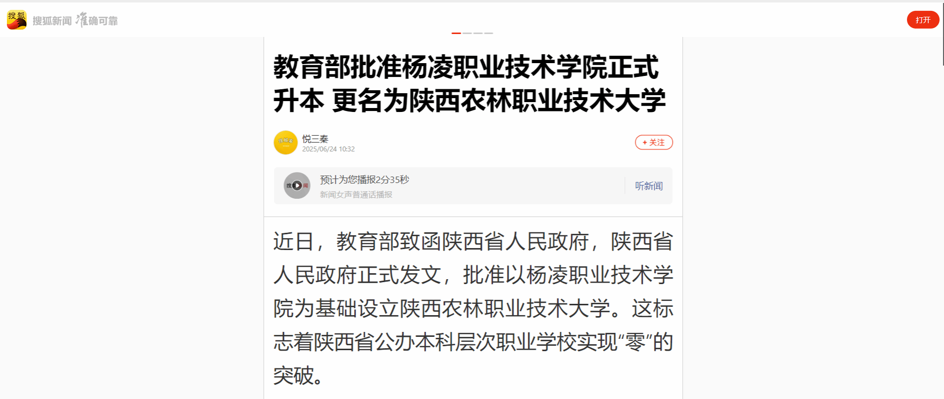 【搜狐】教育部批准杨凌职业技术学院正式升本 更名为365官网