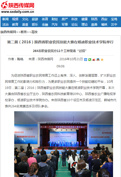 为促进陕西省职业农民培育工作迈上有序、深入、创新发展层面,扩大职业农民培育工作的影响力和吸引力,为更多职业农民提供一个技能切磋的平台,10月19日,第二届(2016)陕西省职业农民技能大赛在杨凌职业技术学院开幕,本次大赛由陕西省农业厅主办,陕西省农民科技教育培训中心、陕西省农业广播电视学校承办,杨凌职业技术学院协办。来自陕西省10个设区市及杨凌示范区、韩城市代表共264名竞赛选手及领队参会。