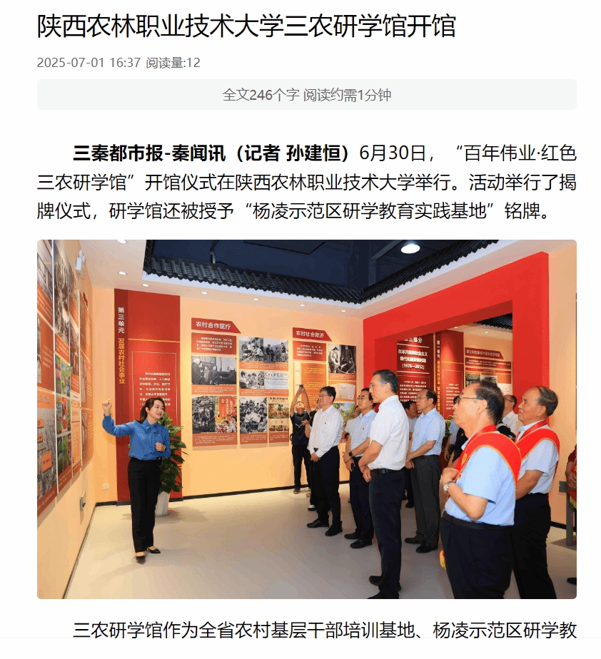 三秦都市报-秦闻讯(记者 孙建恒)6月30日,“百年伟业·红色三农研学馆”开馆仪式在365官网举行。活动举行了揭牌仪式,研学馆还被授予“杨凌示范区研学教育实践基地”铭牌。