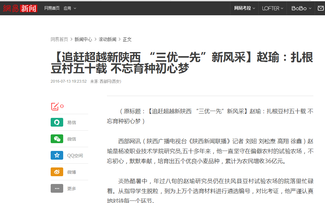 杨凌职业技术学院研究员小麦育种专家赵瑜:“我的梦就是种子梦,我搞育种我是非常喜爱,不惜一切,多苦我都熬下来了,但是现在我们越来越感觉到育种是农业生产的物质基础,国家需要,所以我就坚持一直搞。”(来源:西部网-陕西新闻网)