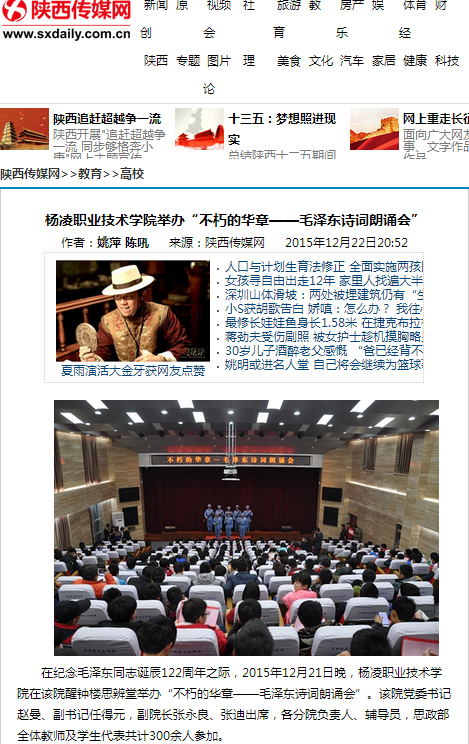 在纪念毛泽东同志诞辰122周年之际,2015年12月21日晚,杨凌职业技术学院在该院醒钟楼思辨堂举办“不朽的华章——毛泽东诗词朗诵会”。该院党委书记赵曼、副书记任得元,副院长张永良、张迪出席,各分院负责人、辅导员,思政部全体教师及学生代表共计300余人参加。
