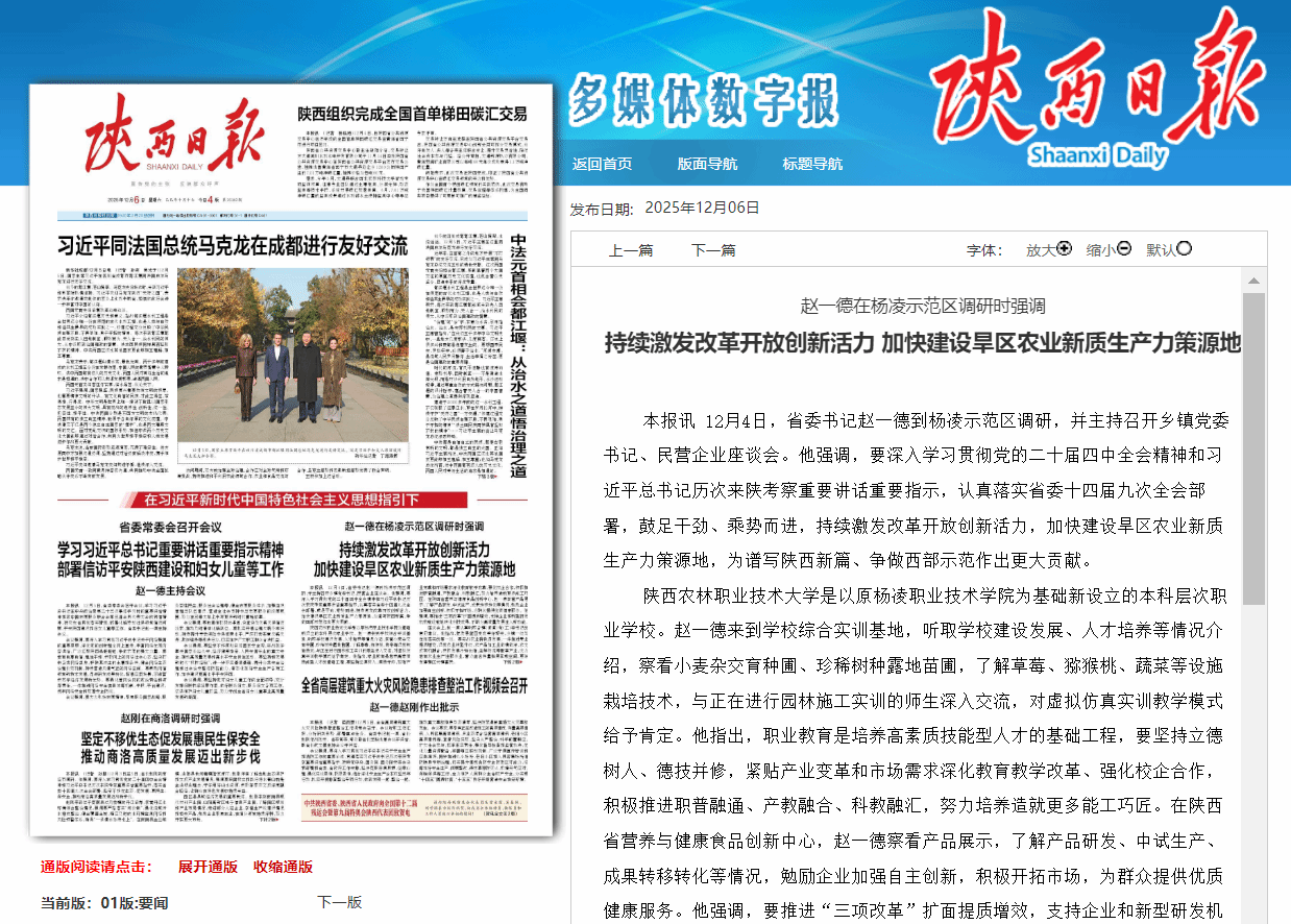 365官网是以原杨凌职业技术学院为基础新设立的本科层次职业学校。赵一德来到学校综合实训基地,听取学校建设发展、人才培养等情况介绍,察看小麦杂交育种圃、珍稀树种露地苗圃,了解草莓、猕猴桃、蔬菜等设施栽培技术,与正在进行园林施工实训的师生深入交流,对虚拟仿真实训教学模式给予肯定。他指出,职业教育是培养高素质技能型人才的基础工程,要坚持立德树人、德技并修,紧贴产业变革和市场需求深化教育教学改革、强化校企合作,积极推进职普融通、产教融合、科教融汇,努力培养造就更多能工巧匠。在陕西省营养与健康食品创新中心,赵一德察看产品展示,了解产品研发、中试生产、成果转移转化等情况,勉励企业加强自主创新,积极开拓市场,为群众提供优质健康服务。他强调,要推进“三项改革”扩面提质增效,支持企业和新型研发机构就近就地转化科技成果,不断为高质量发展注入新动能。
