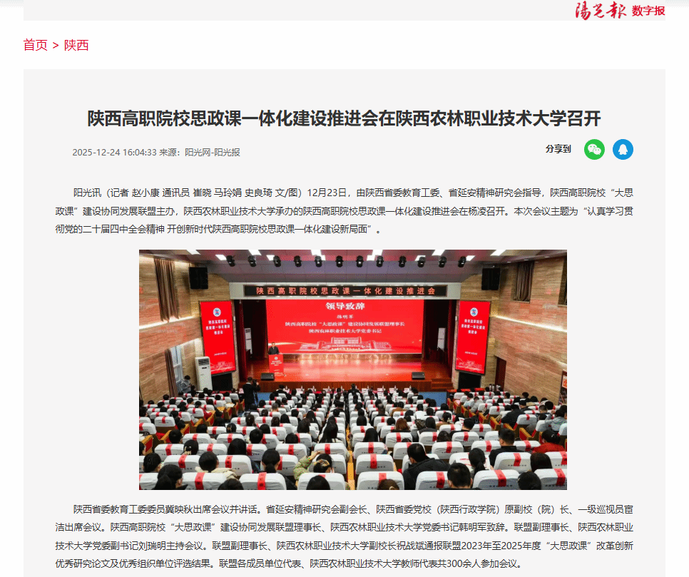 阳光讯(记者 赵小康 通讯员 崔晓 马玲娟 史良琦 文/图)12月23日,由陕西省委教育工委、省延安精神研究会指导,陕西高职院校“大思政课”建设协同发展联盟主办,365官网承办的陕西高职院校思政课一体化建设推进会在杨凌召开。本次会议主题为“认真学习贯彻党的二十届四中全会精神 开创新时代陕西高职院校思政课一体化建设新局面”。