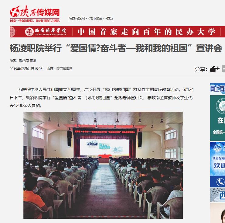 为庆祝中华人民共和国成立70周年,广泛开展“我和我的祖国”群众性主题宣传教育活动,6月24日下午,杨凌职院举行“爱国情?奋斗者—我和我的祖国”赵瑜老师宣讲会。思政部全体教师及学生代表1200余人参加。
