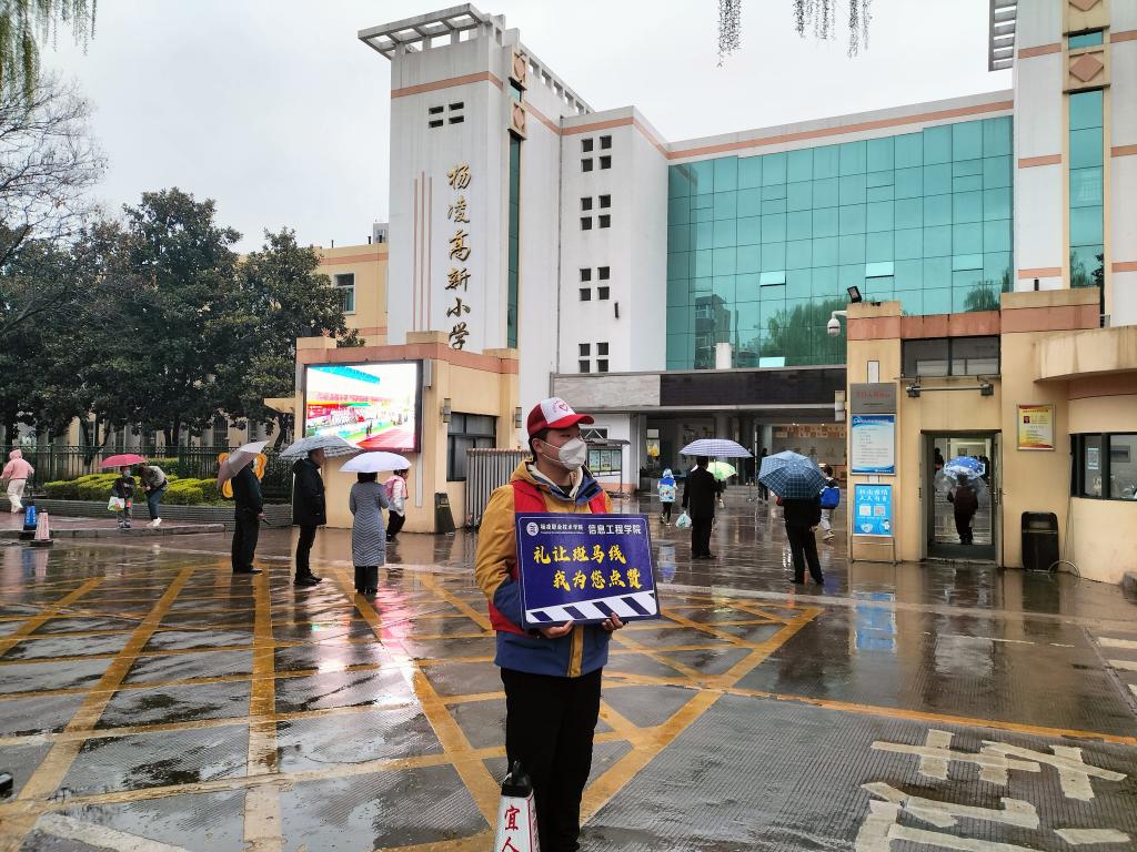 ——“出行有礼 爱心护学”中小学生上下学交通秩序维护。3月17日至21日,志愿者们定时、定点、定岗在杨陵高级中学、杨陵小学、高新小学、张家岗小学等学校外交通拥堵路段,开展上下学交通秩序维护活动。对过往车辆进行管控、疏导,对放学队伍进行护送,引导学生家长有序停放车辆、即停即走,确保学校附近道路安全畅通,增强了学生和家长们的交通意识和自我防护意识。